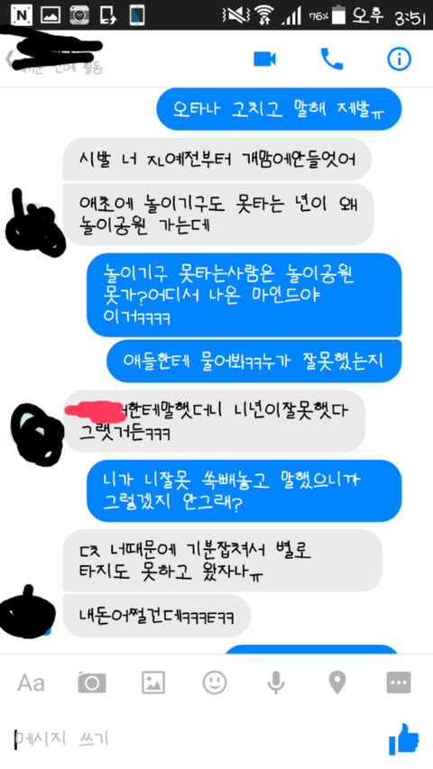롭 그거를ㅋㅋㅋㅋㅋㅋ내가 미쳤냐고 이번엔 진짜 안탄다고 그랬더니 니는 그럼 놀이기구도 못타는게 왜 왔냐고 이럴줄 알았으면 니랑 오는거 아니엿는데 짜증나게 왜 같이와서 이런식으로 화내길래 왜 너혼자 타고 오면 되잖아 내가 기다려줄게하니까 어떻게 쪽팔리게 혼자 줄서냐고 그래서 그럼 내가 줄서는거 까지는 같이 갈께 해서 줄서서 기다리다가 타는데 이제 탈때되서 빠지려는데 걔가 내손잡고 억지로 태울려 그러는거야 솔직히 화나잖아 두번이나 무서운거 같이 타줬는데ㅡㅡ그래서 싫다고 손뿌리치고 나왔는데이시발년아 그럼 오질 말던가 왜왔는데!!!!!! 이러면서 소리치길래 화나서 그냥 집 왔거든?