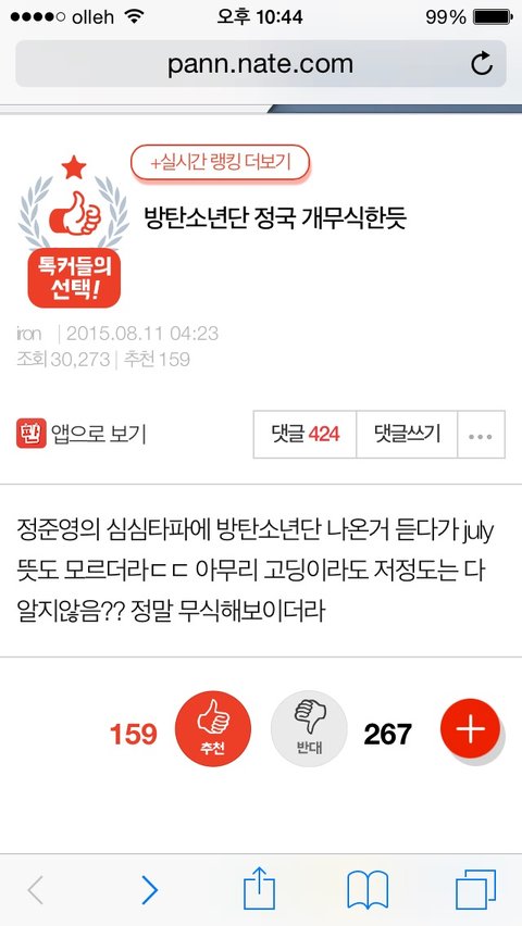 아미들...정국이 까는글 그거 이런 내용이니까 그냥 들어가지 말고 댓도 남기지마 어차피 우리가 댓단다고 그만할것들도 아니고 저런애들은 우리가 댓달고 그러면 더 좋아할 애들이라서 그냥 이런 잡것들도 있구나 하고 넘기게..진짜 별것도 아닌걸로 가루되게 까는거 보면 한대씩 줘 패주고 싶은데 그냥 저런거 신경쓰지 말고 가서 댓달지 말고!!!