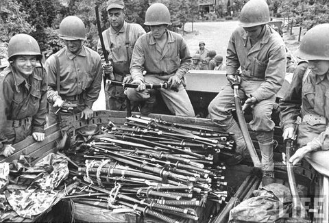 태평양 전선에서 미군이 일본군으로부터 빼앗은 일본도를 바라보고 있다..