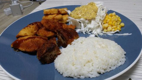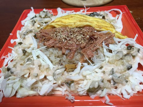 이게 먼가 싶으시죠? 볶음밥에 장조림얹어서 양배추샐러드 옆에뿌린거예여 저도 처음보는음식인데 나름 퓨전음식이라 신기했다는.. 맛은 오묘하면서 계속 땡기는맛이예요ㅋㅋㅋ