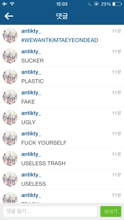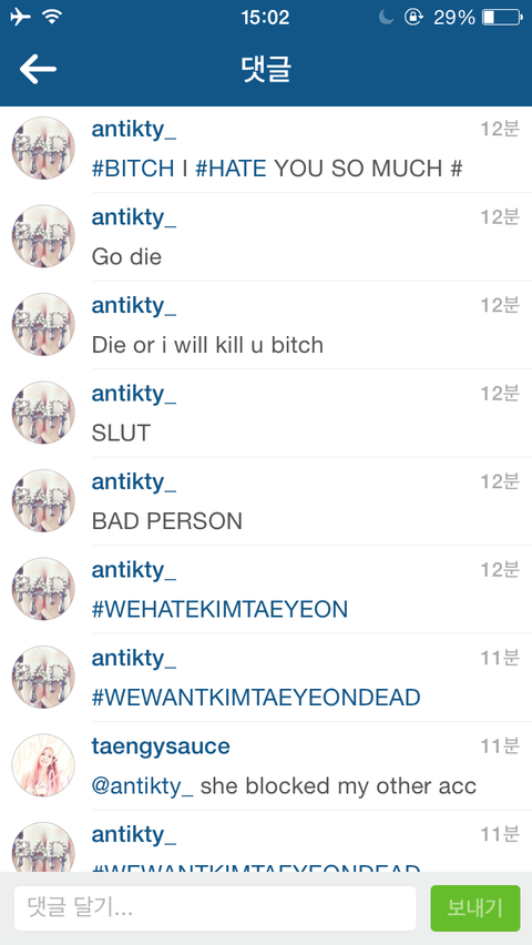 태연 팬도 아니고 안티팬도 아님. 우연히 태연 인스타 찾아서 들어가봤는데 제일 최근 사진 댓글때매 충격먹음;;;; 진짜 인간의 수준;; 죽으라그러고 죽일거라그러고... 태연보고 쓰레기, ㅊㄴ(영어로 slut) 이라함............. 인간적으로 "fu** yourself" 도 너무함... 원래 태연 안티들이 이정도야?? 도데체 태연이 지한테 뭘그렇게 잘못했길래 이정도로 말을할까... 팬도 아닌 나도 소름돋는데 태연은 어떨까..... 아직도 멘붕