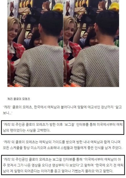 에릭남이랑 진심 잘됐음 좋겠음 ㅋㅋㅋ 미국에서부터 클로이모레츠가 에릭남 팬이어서 오디션때 영상도 다 보고 그랬는데 한국 온다니까 에릭남이 가이드 한다고 해서 되게 좋아했다고 함 ㅋㅋㅋ