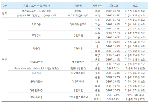 한국소비자원(www.kca.go.kr)이 시중에 유통 중인 어린이용 비옷과 장화 각각 15개 총 30개 제품을 대상으로 프탈레이트 검출 시험을 실시한 결과, 비옷 9개, 장화 2개 등 총 11개 제품(36.7%)에서 프탈레이트의 일종인 다이에틸헥실프탈레이트(DEHP)가 검출됐다.
