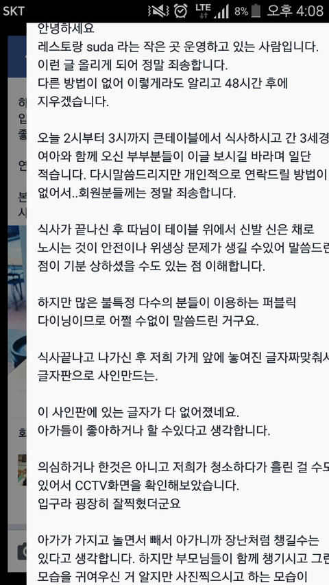 부부가 아이를 데리고 레스토랑에옴>아이는 신발신고 테이블위를 돌아다님> 점심장사후 확인해보니 글자가 사라짐>씨씨티비확인>그손님들 소행으로밝혀짐
