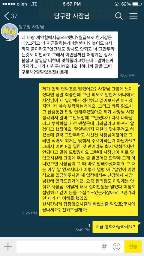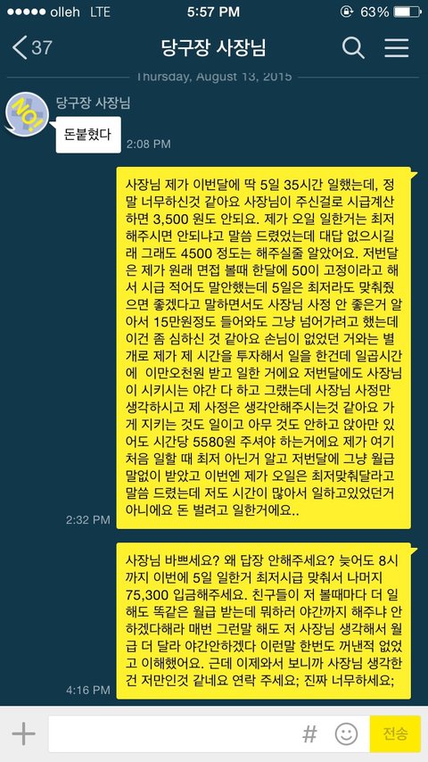 불만이라면 사장님이 점점 퇴근시간을 안 지키시고 하시고싶은거 다 하시고 늦게오거나 주말에도 근무를 부탁하고, 야간이 일주일에 한번이 아닌 두번씩 늘어나고 그랬어요. 제가 등신이라 누구를 탓할수도 없지만 똑같은 월급받고 뭐하러 호구같이 일하냐고 주변에서 다들 그렇게 욕하고 했지만 나름 좋은 사장님이라고 그만두기도 미안하다고 하면서 애써 자기위로하면서 일을 계속했습니다 제 친구들도 자주 놀러오는편이였는데 사장님 친구들을 보고 끼리끼리 논다고 정말 별로같다고 빨리 그만두라고 했었구요.. 자꾸 술 같이먹자고 전화로 부르실때도 있었고 한분은 제가 가만히 서있는데 살좀보라고 뱃살을 꼬집고 제 허벅지 뒷부분을 꼬집은적도 있어요 이 부분은 제가 확실히 싫은티를 너무 많이내서 그 친구분은 나중에 아예 놀러를 안오셨구요. 첫 월급날이 8월1일인데 그 전날까지도 계좌번호, 월급시간 물어보시지 않길래 어렵게 제가 먼저 말 꺼냈습니다. 다음날 시간도 제대로 말 안해주시고 돈이 들어와야 보내준다 라는 식으로 말해서 한번 트러블이 있었습니다. 걸국 월급날을 어겨서 보내주시진 않았지만 이때부터 정말 별로라고 생각하고있었어요 점점 장사가 안되는 마당에 사장님이 몇일 기분이 안좋으시더니 저한테 장사가 너무 안되서 일을 그만해줘야할것같다 미안하다고 와이프가 가게를 볼 것 같다 라고 말 하셔서 괜찮다고 저도 이김에 휴가가고 그러면 되겠다고 그랬습니다. 친구들이랑 기분좋게 맥주마시러 가는데 다시 전화가 와선 미안하다고 다시 일해달라길래 저한테 미안하서서 그런거면 괜찮다고 당구장 사정생각해서도 알바안쓰는게 맞는것 같다고 했는데 지금 생각해보면 아내분이 당장 가게를 못 봐주는 상황이라 절 부른것 같아요. 그렇게 주말에 저는 고향내려가서 쉬고 몸이 안좋던 마당에 토하고 링겔을 맞는 상황이라 하루 출근을 못하겠다고 카톡을 드렸습니다 마침 그날이 사장님 당직날이였구요 괜찮냐 이런말 한마디 없고 ㅡㅡ.. 이런식으로 오셔서 제가 다음날 야간 해드리겠다고까지 말했습니다.