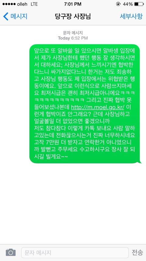 만약 자기 자식이 커서 최저도 못받고 일하면 가만히 계셨을까요? 통화하면서 정말 말이 안통하는 사람이라고 느꼈습니다.