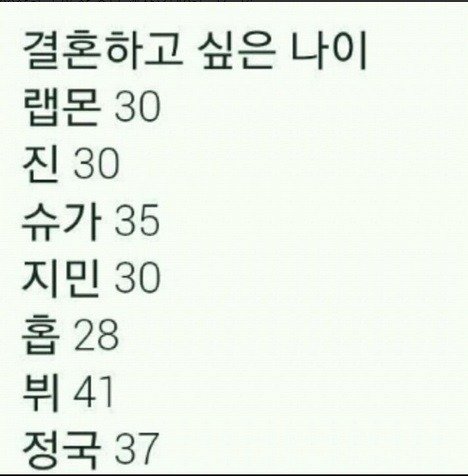 태형이 너무 늦게 하고싶어하는 거 아님?ㅋㅋㅋㅋ오 근데 홉이는 애들 중에서 제일 일찍 하고 싶어하네 난 갠적으로 30~35정도가 적당하다고 생각함