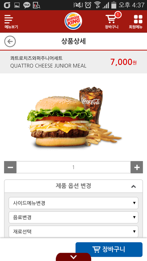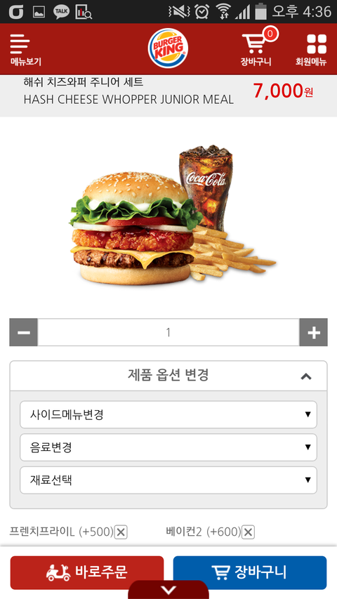 버거킹은 주니어와퍼세트로해서 감자 라지로 바꾸고 베이컨2장 추가해서 둘다 8100원