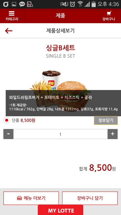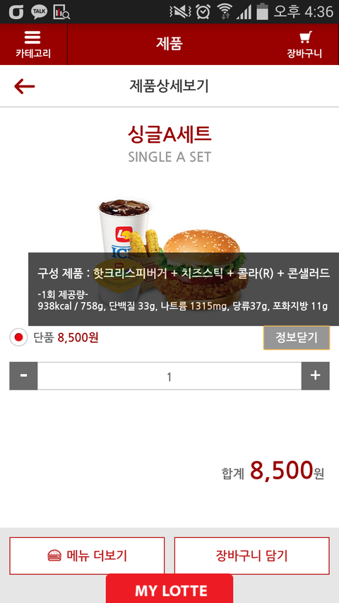 롯리는 싱글세트a 핫크리스피 콜라 콘샐러드 치즈스틱 8500원