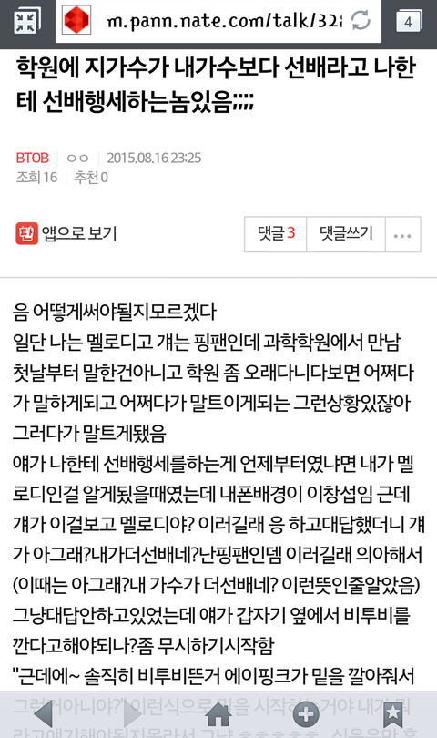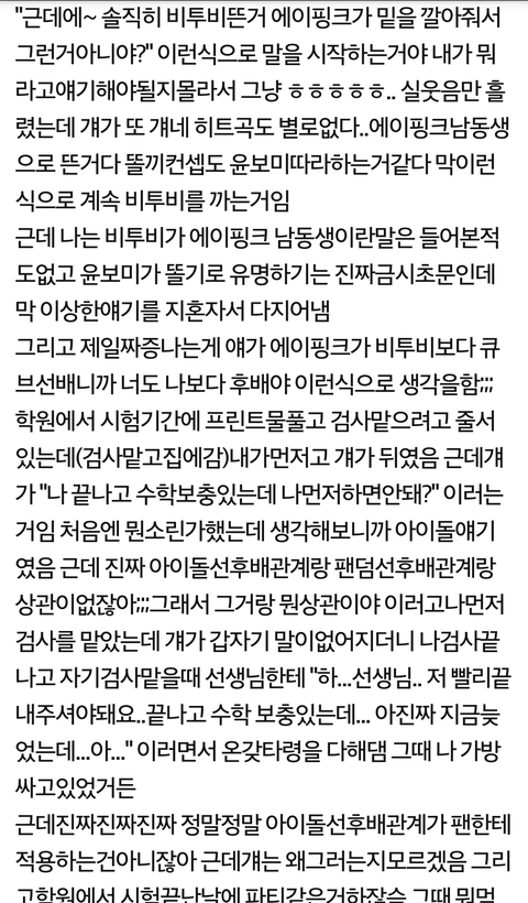이거 멜로디가 쓴건데 ㅋㅋㅋㅋ 학원에 같이 다니는 에핑팬이 자기 가수가 비투비보다 더 선배라고 학원에서 선배 부심부린다는 내용 ㅋㅋㅋㅋㅋㅋㄱㅋㅋㄱ 그니까 니네도 쎌씨팬한테 선배 부심 부리지마 ㅋㅋ ㅈㄴ 꼴불견이야 ㅋㅋㅋㅋ 저 글쓴이 말대로 가수가 선후배 관계지 팬들 사이가 선후배가 아니잖아 ㅋㅋㅋㅋㅋㅋ 부메랑 ㅊㅊ