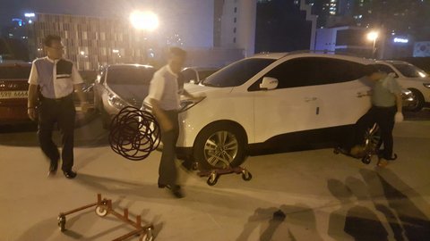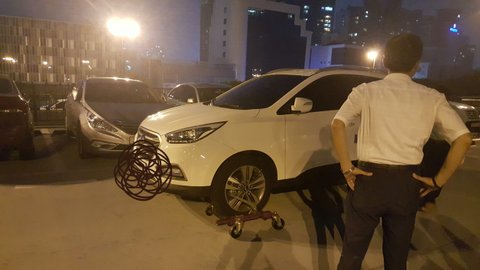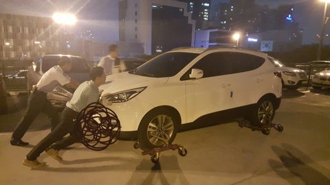 두분이 오셔서 밀어도 꿈쩍도 않고 결국 다른 아저씨들 두분이 차량 바퀴를 드는 기계를 가져오셨습니다...