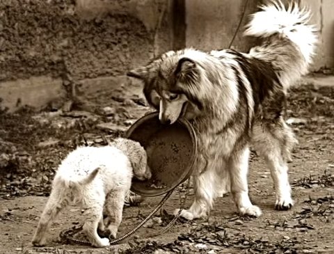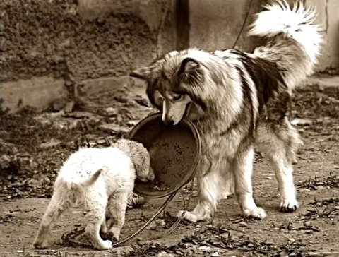 몸집이 큰 말라뮤트가 작은 개에게 자신의 밥을 양보하는 감동적인 한장의 사진이 가슴 뭉클하게 한다. 자신이 곧 죽을 운명에 처해 진 줄도 모르게 작은개가 편히 밥을 먹을 수 있도록 배려해 준 영상이 유튜브에서 조회수 35만명을 넘으며 화제가 되고 있다.