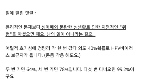 업소정보알려주고 그런 인간들 모인 사이트가보면 그런 남자들 드글드글한데 그사람들 논리가 더 가관임 자기들이 뭘 잘못한다는 인식도 없는듯 돈있고 능력있으면 갈수도 있는거래 성을 사고파는건 아주 먼 옛날부터 이어져온거라고 공부나 더 하고오래 성을 사고판다는거 자체가 잘못됐다고는 생각안하는듯