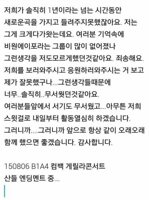 이거 이번게릴라콘서트때 산들이가 울면서 말한거ㅠㅠㅠㅠㅜ볼때마다 왠지 그냥미안해져..