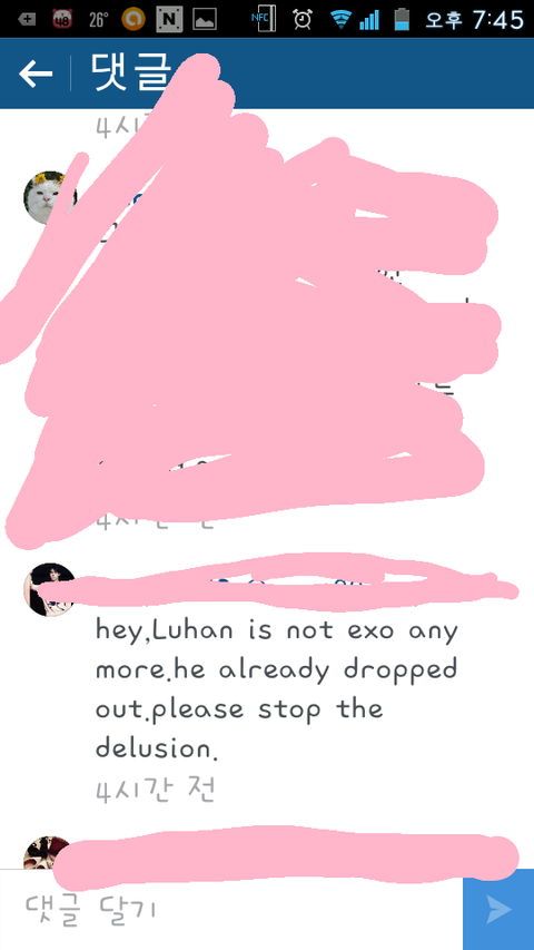 세훈이 인별보다가 어떤 외퀴가 훈한 훈한 이러길래 반박글을 짧은 영어실력으로 달았더니 부들부들잼ㅋㅋㅋ참나 기사도 안보고 사나봐?공식탈퇴한지가 언젠데 지랄이야 기사 다 났구만