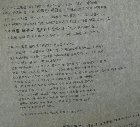 너네 팬톡 이런글에 추천하나도 안달리고 어그로도 안끌리는구나ㅠㅠ 부럽다 우리 어그로천진데ㅠㅠ 무튼 오늘 타팬톡에서 어그로끌린거 미안해.. 속상하겠다ㅠㅠ 인피니트도 요즘 엔터톡에서 많이 까이던데 여러모로 신경 많이 쓰일듯.. 무튼 화이팅하자!!