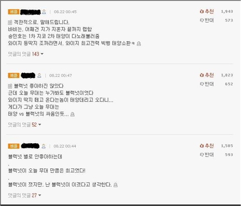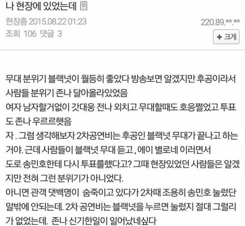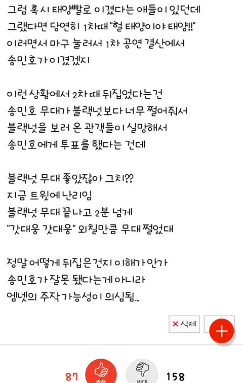 아 짜증나는게 송민호는 지가 yg딱지를 뗀다하면서 yg간판을 데리고오고 이렇게되면 솔직히 블랙넛은 일반인이니까 연예계에 인맥이 없으니까 당연히 불공평하잖아 그리고 송민호빠순이년들이 쇼돈보러가서 무대는 안보고 송민호한테 투표만 하고 나오고 ㅋㅋㅋㅋㅋㅋㅋㅋ 위너팬이랑 빅뱅팬덤이 얼마나 큰데ㅋㅋㅋㅋㅋ그리고 솔직히 사람들 거의다 블랙넛이 더 잘했다 했는데ㅋㅋㅋㅋㅋ지금 페북이나 그런 sns에서 난리난거보면 사람들이 송민호가 이긴게 납득이 안갈정도로 블랙넛이 잘했다는 소리잖아 근데 왜 블랙넛한테 욕함ㅋㅋㅋ.....블랙넛잘했다고 하면 어짜피 송민호가 이겼으니까 가만있으라하고 ㅋㅋㅋㅋㅋㅋ그리고 베이직 vs 이노베이터떄든 언제든 항상 1차공연비 2차공연비 다 불러주고나서 총 공연비 불러줬는데 왜 송민호vs블랙넛 때는 1차공연비만 불러주고 바로 총공연비불러줌; 1차떄 블랙넛이 80만원이나 더 많았는데 총공연비는 송민호가 40만원이 더 많은거 보면 2차공연비가 약 120만원이나 차이난다는건데 그정도로 블랙넛이 송민호보다 못했음??? 보통 총공연비는 40만원 50만원정도로 차이가 나는데 왜 블랙넛이랑 송민호는 120만원이나 차이남?이상하지 않음??아무리 차이가 많이나도 100만원정도 차이나는데