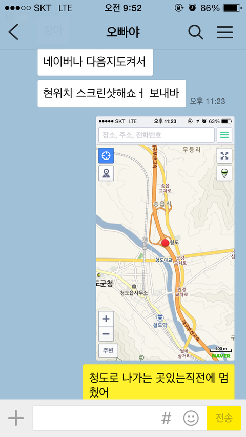 집에있는 친오빠에게 진짜 미안하다고 청도 톨게이트사무소까지 데리고 와달라고 했고,