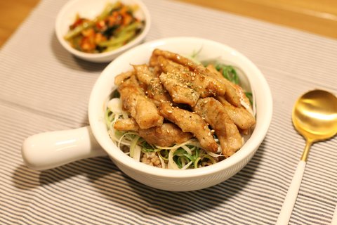 밥위에 파채 양파 올리고 양념에 졸인 항정살 올리면 끝 넘 맛있어요.