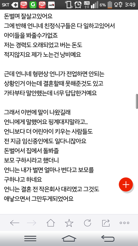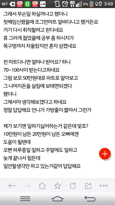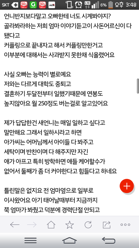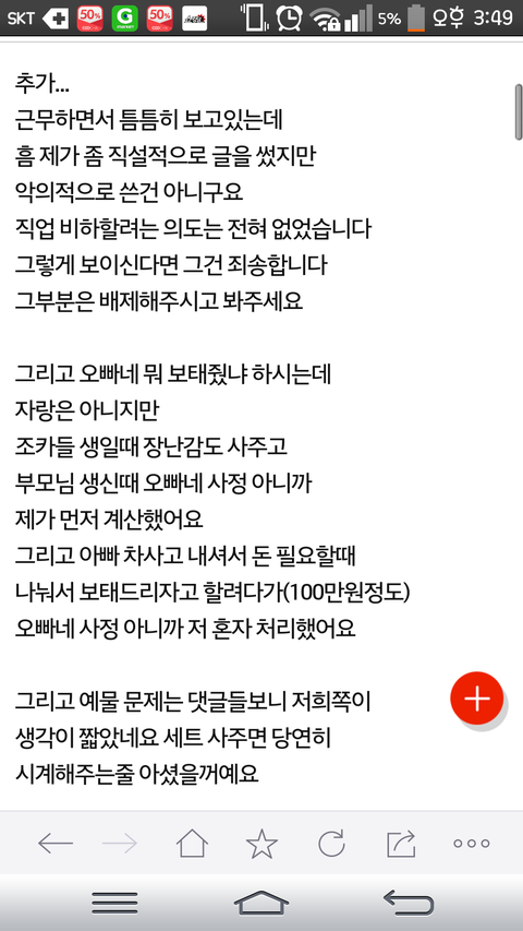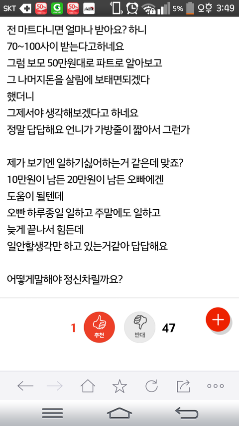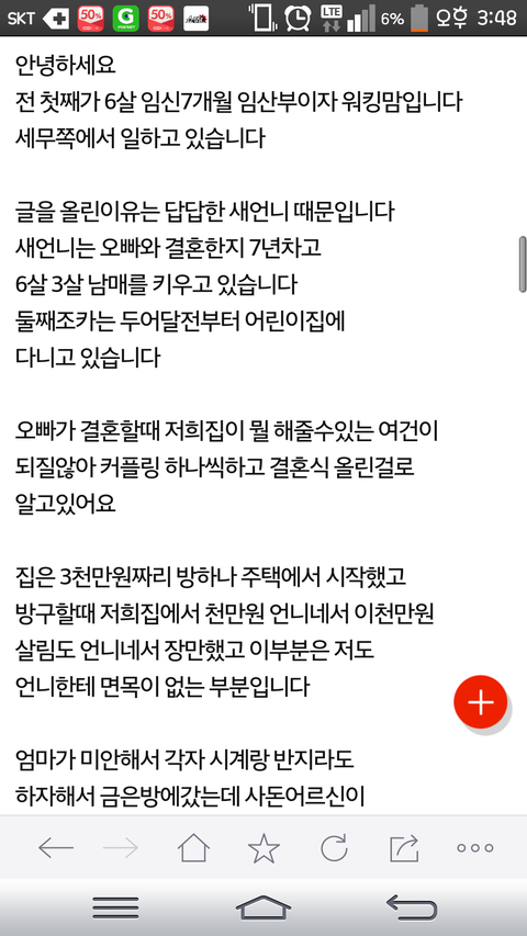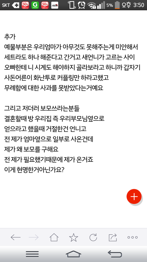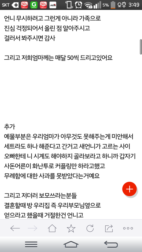 다시 읽어도 ㅁㅊㄴ.친정엄마 애봐주는데 50주면서 부려먹는 '현명한' 분.판 보는 사람이면 애 안봐줘도 50주는집 많은거 알텐데 그거 준다고 생색내고.친정챙기고 조카 선물 사준건 벼슬