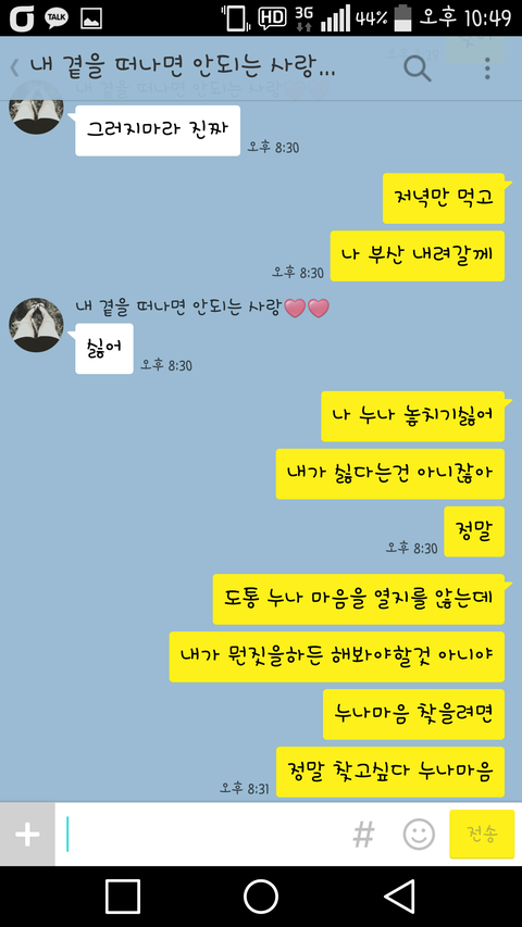 내가 못 해 준 게 많은데 정말 떠나 갈까봐 이제 사랑을 성실하게 줄려고 하니깐 마음이 떠나가서 정말 힘들었습니다.
