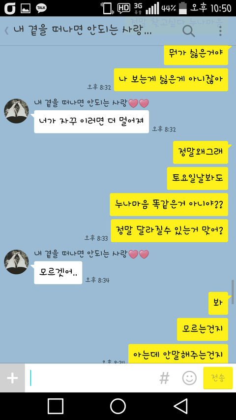 나는 이별을 생각하는 것 자체도 싫은데 전화할 때 여자친구는 단답에 어떻게 단칼에 변할 수 있는지 정말 이별을 생각하나 싶을 정도로 생각하게 만듭니다. 아니면 일부러 힘들게 해서 헤어지게 하려는 걸까요?