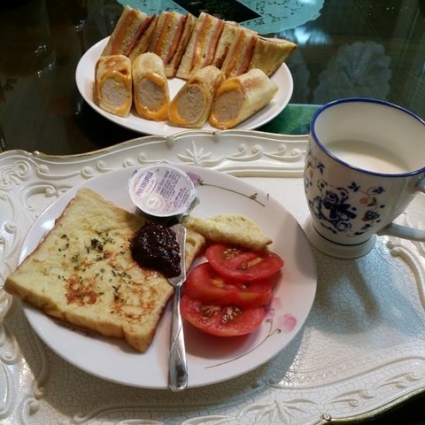 몬테크리스토샌드위치를 만들고 슬라이스햄이 부족하여 동생의 닭가슴살소시지로 대체하였습니다  그냥 손가는대로 만든거라 이름은없어요 소시지랑 빵이랑 잘붙어있으라고 사이에 치즈를 넣어 돌돌 말았습니다 (사진은 SNS용 뭔가여유있는 브런치느낌의 컨셉이예요 사진만찍고 쟁반과 저 크림치즈는 치워버렸습니다 ㅋㅋ)