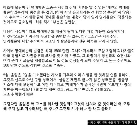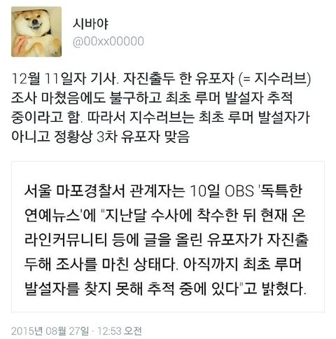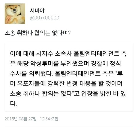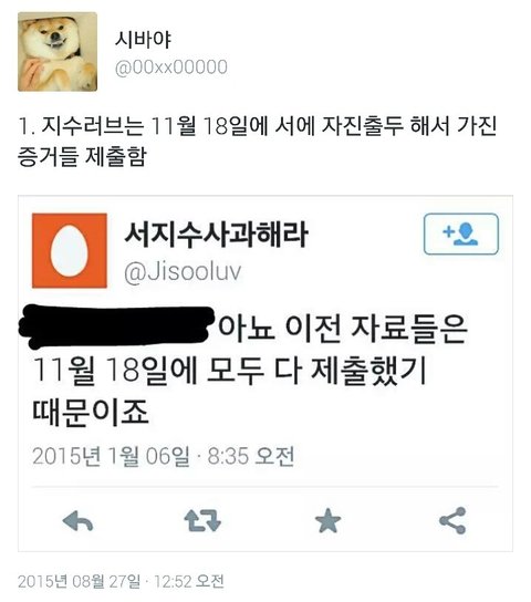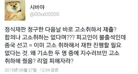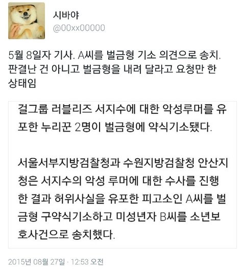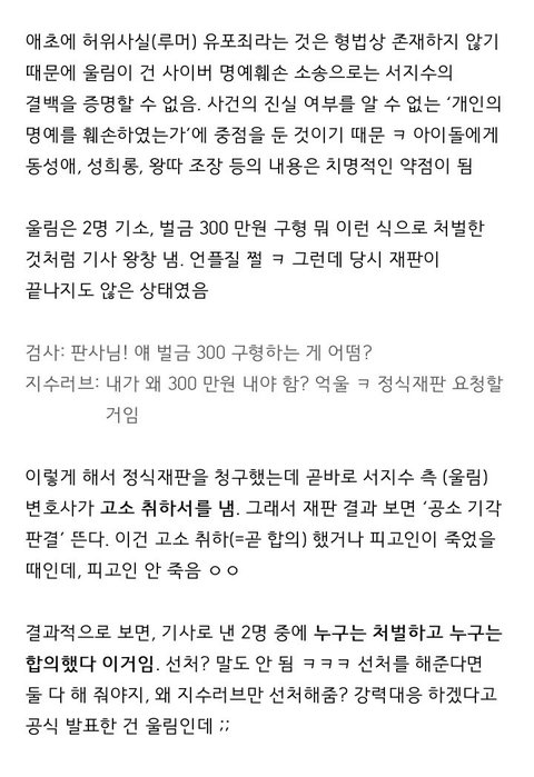 와 진짜 말 안 통하는 사람들 많네. 고소취하 했다는거 다 구라에요 고소취하를 하려면 일정한 기간 내에 해야 하는데 고소취하했다는 서류는 날짜가 완전 안 맞아요. 그리고 몇몇 합의 본 유포자들은 모두 미성년자고, 성인은 다 처벌되었고요. 어떤 놈들은 왜 아무도 감옥에 안 들어가냐 그러는데, 이건 허위사실 유포에 의한 명예훼손 이기때문에 우리나라 법은 오로지 벌금형만 먹여요 제발 뭐 알고 지껄여주시고 별 같잖은 카톡 증거 들고올거면 제발 닥치세요 (댓글보다 펌함)