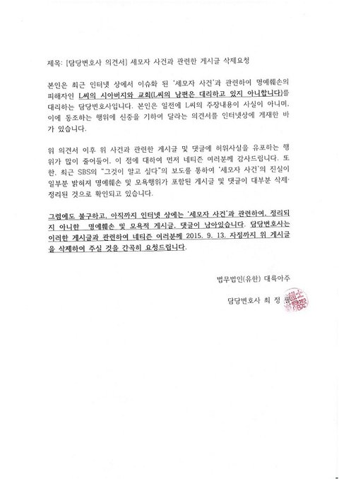 그럼에도 불구하고, 아직까지 인터넷 상에는 ‘세모자 사건’과 관련하여, 정리되지 아니한 명예훼손 및 모욕적 게시글, 댓글이 남아있습니다. 담당변호사는 이러한 게시글과 관련하여 네티즌 여러분께 2015. 9. 13 자정까지 위 게시글을 삭제하여 주실 것을 간곡히 요청드립니다.