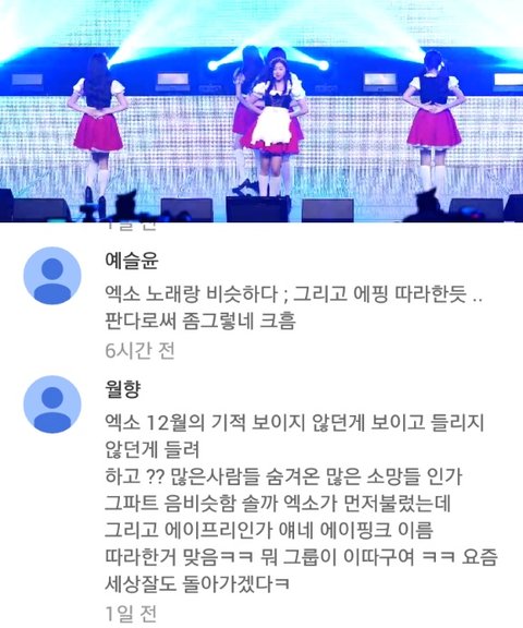 솔직히엑소12월의기적과비슷하다는 하도많이나왔고 실제로도비슷하기때문에그런생각가질순있는데 대체뭘보고에이핑크를따라했다고하는건지