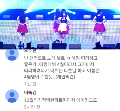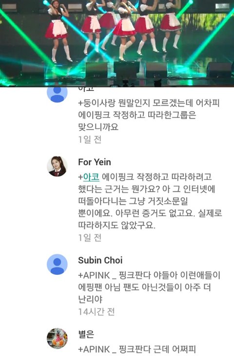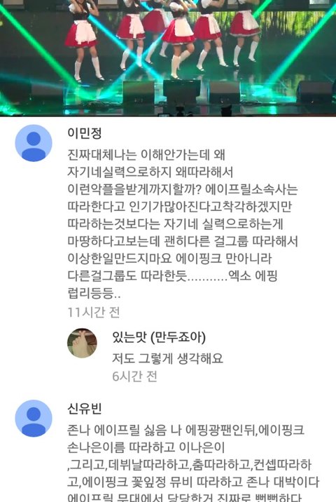 유튜브댓글뿐만아니라 에이핑크/에이프릴팬카페가아닌 지식인 블로그등등에는 아직도저런글이많이올라옵니다. 초딩이나카스하는사람이썼다고해서 이런행동이용서되는건아니지않나요? 결국에이프릴이읽게될이야기인데.