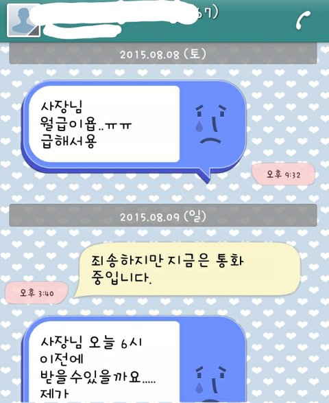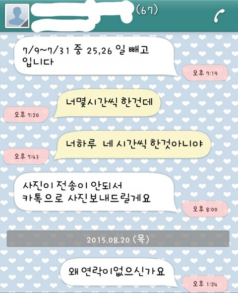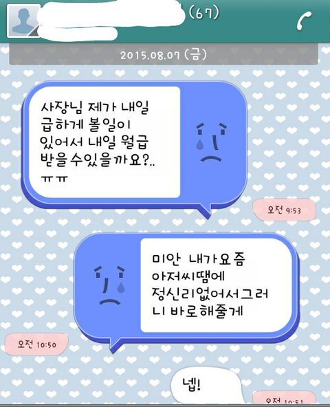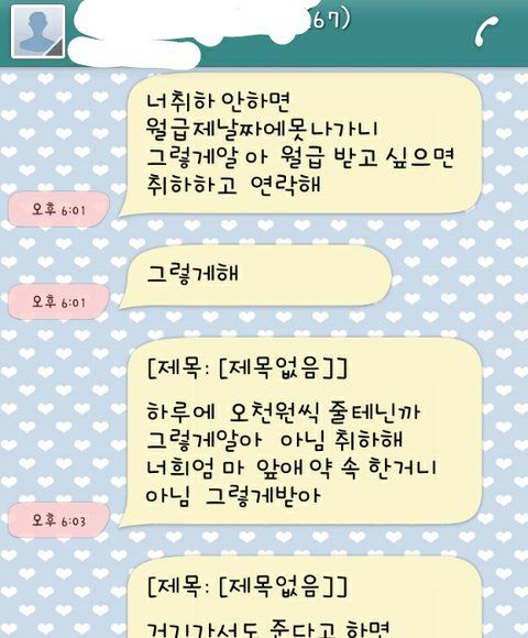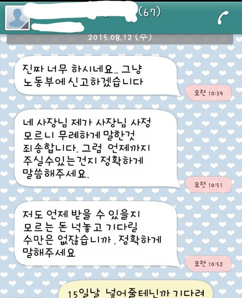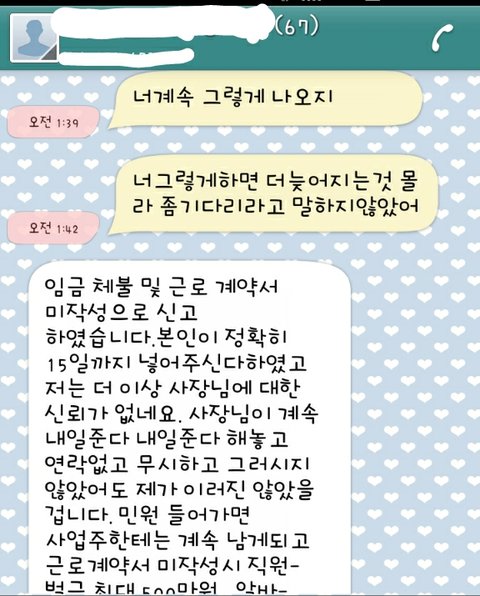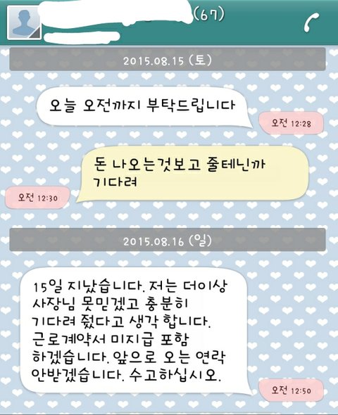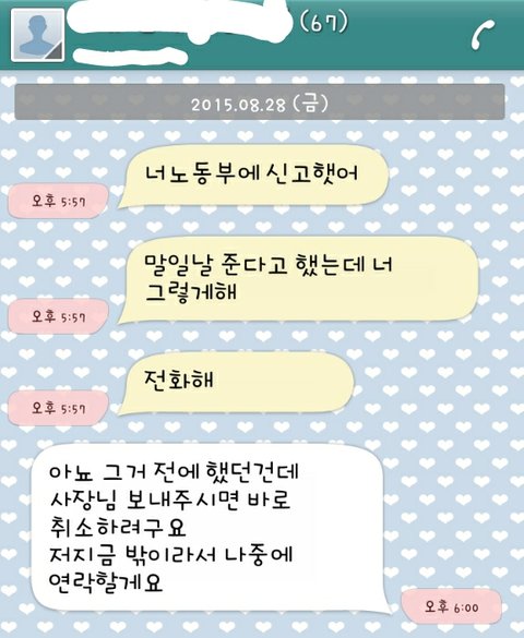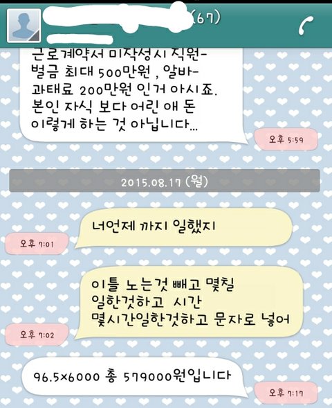 그랬더니 내가 어리니까 넘어갈거라고 생각했는지 협박 비슷한 말들 계속하며 돈을 뭐 매일 오처넌씩 주겠다 그럼 노동청에서도 뭐라 못한다 이런말을 하네요..