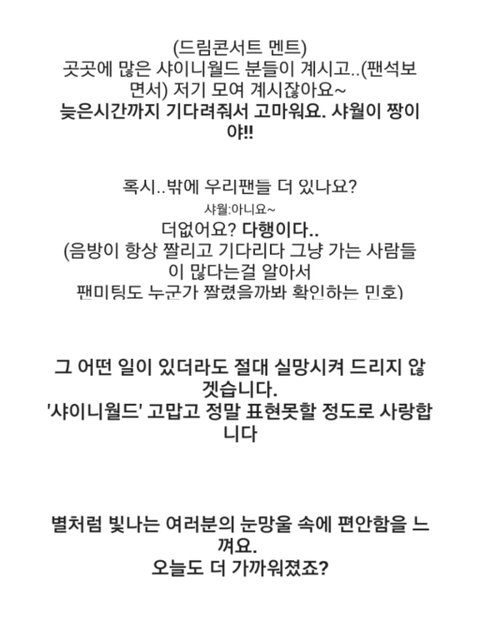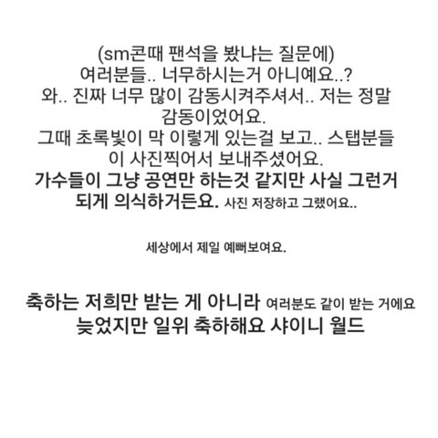 팬을 사랑해주는 자세는 역조공이 아니라 샤이니같이 자기팬들을 힘들게 하지 않는것과 팬들을 떳떳하게 만드는것 같음 실력면으로 떳떳 하게 만들고 8년간 활동하면서 팬들 울리지 않고 얘네는 진짜 팬들한테 잘하는 법을 누구보다도 잘아는거 같음
