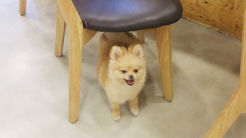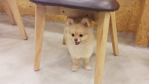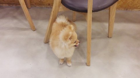 애견카페 도착해서 의자 밑으로 슝~들어가 슬금슬금 눈치보더니...