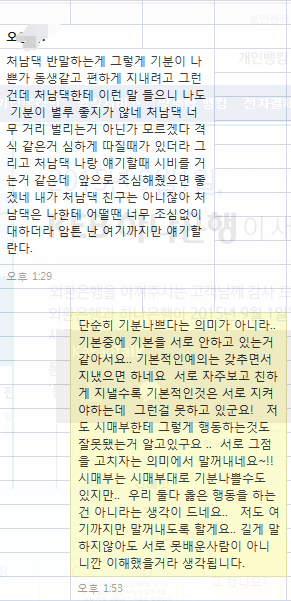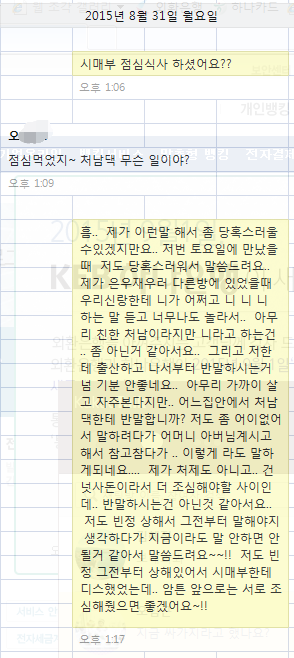 암튼 이거외에 상상을 초월하는 무개념짓을 많이하지만 너무 말이 길어질거 같아 최근에 있었던 카톡을 첨부하겠습니다. 집안 분란을 안일으킬라고 참고있는데.. 이런 무개념 개쓰레기는 처음보네요.. ㅡㅡ 거지집안에 성격파탄자에 개념 예의도 없는 그러면서 말은 많고 씨끄럽게 구는 이양반 어쩌면 좋나요? 지금 시누이 시댁식구들 죄다 이사실 알고잇고 저보고 이해하라고 속좁은 인간이라서 그렇다는데.. 저도 뒷끝있어서 그런지 그냥 넘어가지는 못하겠네요..