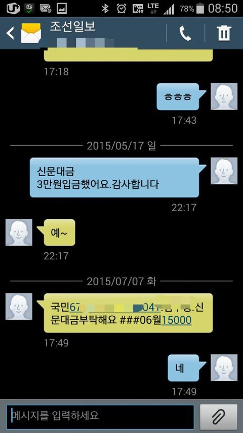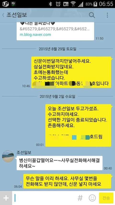 현재 조선일보을 구독중이였습니다 저희 어머니께서 8월29일에 '사무실이 연락이닿지않는다 이번달까지넣고 다음달부터 넣어주지말아달라'라고 카톡을 보냈지만 무시당했습니다. 오늘9월2일 넘어오는밤 신문이 들어와서 다시 연락드렸지만 답은 저렇게왓네요 현재 가족들의항의로 사과연락이 왔는데 세상을보는눈이라며 링크를 보내오지않나 분명 사무실과 연락이 안된다고 했음에도 불구하고 사무실로연락하라하질않나 헛소리만 하네요. 회사로 연락을 했더니 사과 연락 준다고했는데 아직까지 연락이 없는 상태입니다. 별다른 피드백 없이 넘어가는것 같아 찝찝하네요 다른분들은 다른 신문사에 제보를 하라 , 본사에 연락을 하라, 고소를 해라 여러의견이 많은데 현글쓴이는 유학중이라 어머니대신 글을 쓰게되네요.. 많은 조언 부탁드립니다