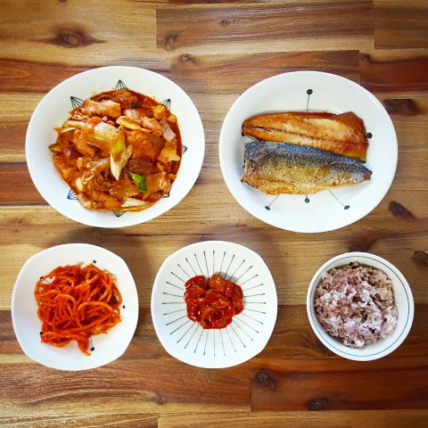 김치 삼겹 두루치기 & 고등어구이 & 오징어채 & 매실짱아찌