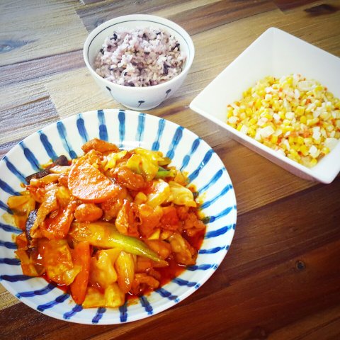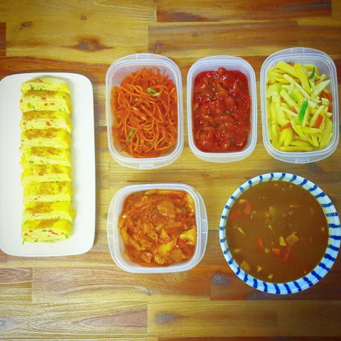 계란말이, 오징어채, 감자볶음, 매실짱아찌, 카레, 김치볶음