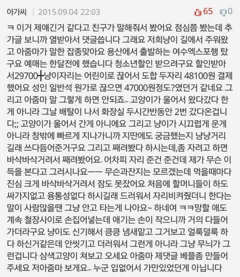 아가씨 넘넘 죄송하지만~애기땜에 정신이 없어 예매를 못해서 입석을 끊었는데 혹시 고양이는 선반위나 발밑에 두시고 자리 잠깐 빌릴수 있을까요~하니 댄번에 고양이가 무겁다고 힘들다구 하더라구요...