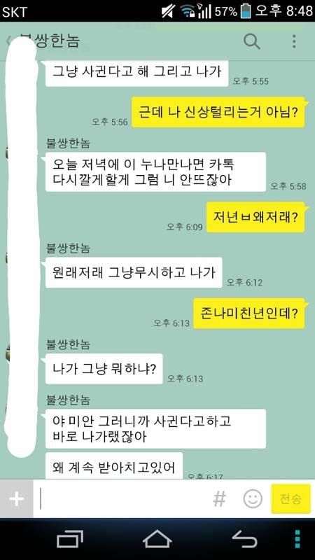 글쓴이 진심 불쌍한 놈임 욕하지마 장기밀매자도 아니고 프사 교복입고있고 멀쩡한 18살 맞는데 미친 여자한테 기죽어 사나봄 내가 진짜 장난으로 카톡하고 가벼운 마음으로 단톡했는데 조카 감정이입해서 싸우고 나옴 이년 그냥 싸이코임 진심으로 학교폭력으로 신고가능함 단톡내용 올리고 싶다;