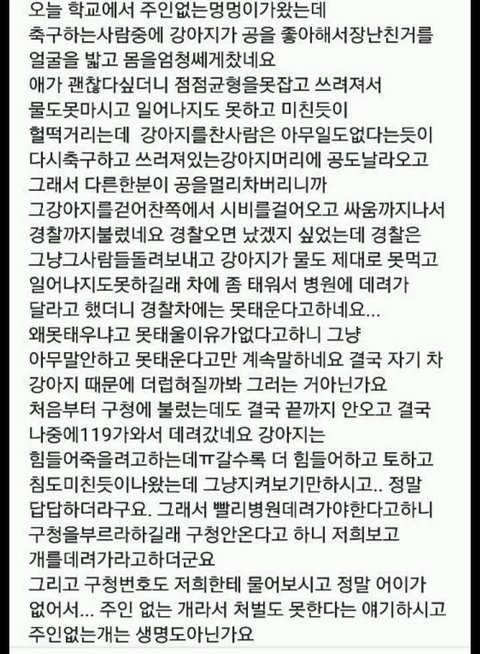 대학생 중 한 명이 개를 차버리고, 머리를 밟아서 개가 저 지경이 됐답니다.