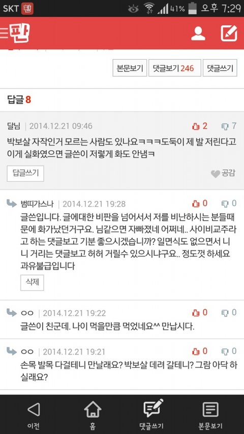 자작이든 아니든을 떠나 늘 그런 댓글은 있었고 제가 남긴 댓글이 옳다고는 말 못하지만 이것 또한 저의 개인 의견이었기 때문에 아무생각 없이 남겼는데 박보살님이 제 댓글에 "못 믿겠으면 박보살과 함께 나오겠으니 만나자"라고 하셨습니다.