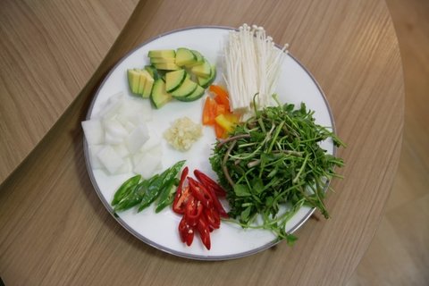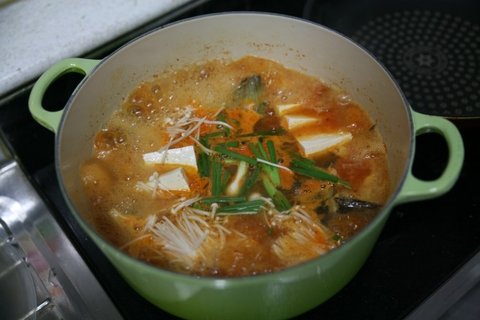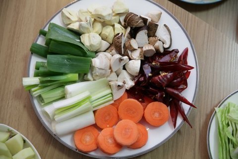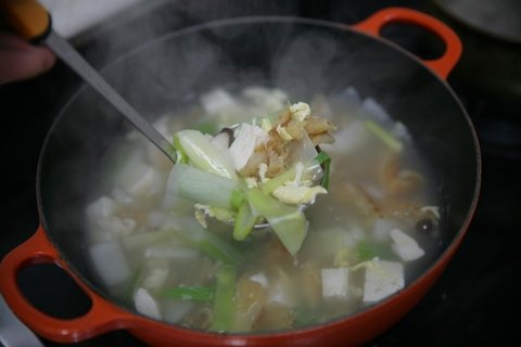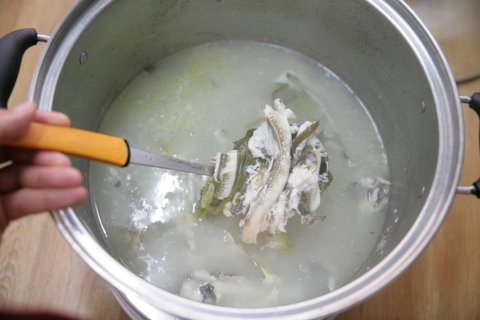 잘 고아서 소쿠리에 뼈는 걸러내고 얼갈이배추 국산고사리 숙주나물을 넣고