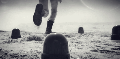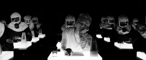 획일화된 가면쓴 사람들과 헤머를 든 사람 기존것을 깨는장면 분위기 등등