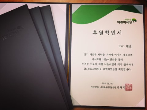 팬톡 기부 프로모션 결과에 따라 EXO 채널명으로 기부금 1,500,000원이 후원되었습니다.