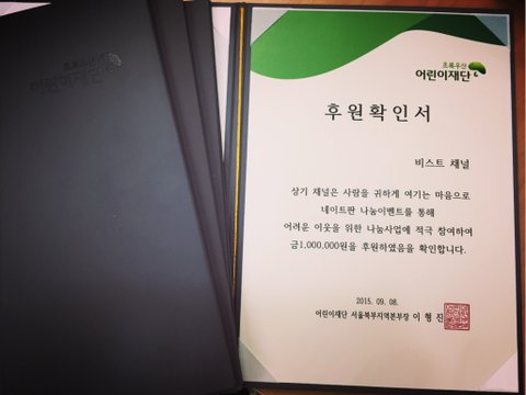 팬톡 기부 프로모션 결과에 따라 비스트 채널명으로 기부금 1,000,000원이 후원되었습니다.