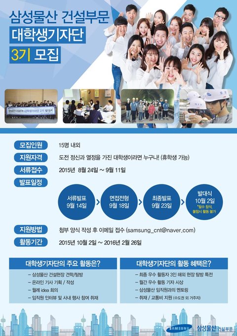 삼성물산 건설부문의 이모저모를 취재하여 ‘나만의 특별한 시각’ 을 세상에 알리는 커뮤니케이터 역할을 수행하게 됩니다. 통통 튀는 글재주와 뜨거운 열정! 건설에 대한 관심만 있다면 전공불문, 휴학생 불문!