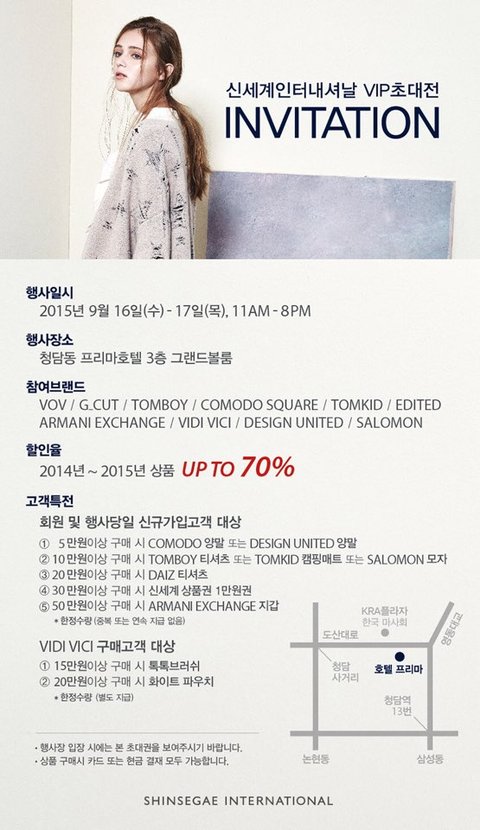 신세계인터내셔날에서 우수 브랜드 VIP 고객초대전을 한다구해용최대 70%까지 할인된다구 하네요 참여 브랜드는 VOV, g-cut, DESIGN UNITED, SALOMON, TOMBOY, TOMKID, comodo SQUARE, VIDI VICI 로 많네요 ㅎㅎ 자세한 내용은 이미지에도 나와있으니 참고하시면 좋을 것 같아요ㅋㅋ