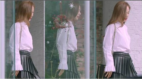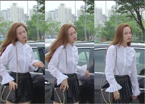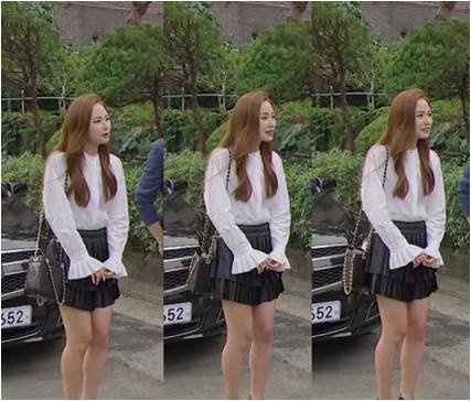 프릴 달린 블라우스에 앙증맞은 힐다백까지 메고 한껏 귀엽게 입었어도,