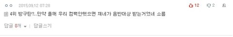 내가 베플 보고 한 게시물에 들어갔거든? 좋은 댓글 달려고 딱 들어갔는데 ㅅㅂㅋㅋㅋㅋㅋㅋㅋㅋㅋㅋㅋㅋㅋㅋㅋ 저런 댓글 있어 심지어 하나만 들어갔는데 다른 게시물에는 얼마나 까일까; 와 진짜 기분나빠서 ㅅㅂ 저기 댓글 달긴 했는데 진짜 개념없는거 아니냐;?